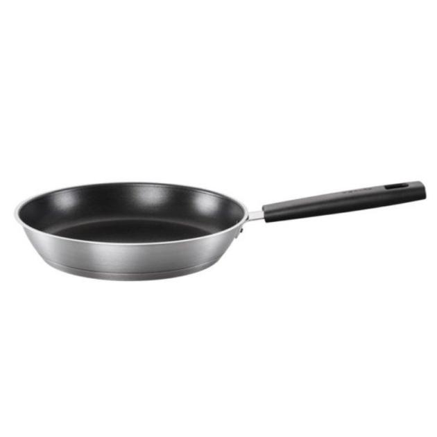 Patelnia 26cm ze stali nierdzewnej Fiskars posiada doskonałe właściwości nieprzywierające, w tym grube trójwarstwowe dno, które równomiernie rozprowadza ciepło, co pozwala zaoszczędzić energię. Posiada bakelitową rączkę, która utrzymuje chłód.