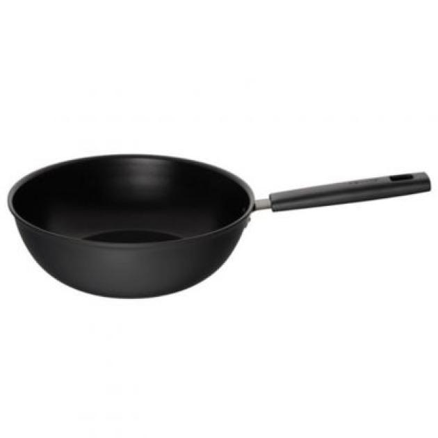 Aluminiowa patelnia wok Fiskars do trudnych zadań. Właściwości nieprzywierające, powierzchnia Hardtec Superior, bezpieczny uchwyt Bakelite, grubsze energooszczędne dno, nowoczesny czarny design.