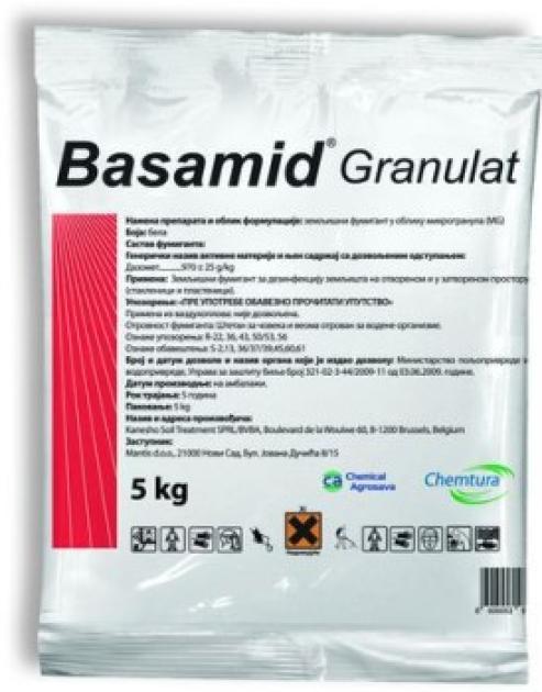 lub wapna. Podczas dezynfekcji produkt rozprowadza się równomiernie na powierzchni gleby (za pomocą rozsiewacza, ręcznie) i natychmiast wciera na żądaną głębokość, po czym powierzchnię wyrównuje się lub lekko walcuje. Aby zapewnić wystarczającą wilgotność gleby przez 3-5 dni po aplikacji, suchą glebę należy zraszać aż do osiągnięcia niezbędnej wilgotności. Aby to utrzymać i zwiększyć skuteczność Basamid, zaleca się przykrycie leczonego obszaru przez 5-7 dni plandeką, plastikową płachtą itp.